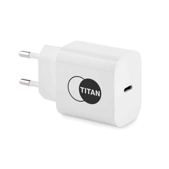 The Promotional 20W USB Charger features a compact EU 2-pole wall adapter design, delivering 20W output with both USB-C and USB ports. It supports Quick Charge 3.0 and Power Delivery technology for efficient device charging. Please note, this charger is not suitable for UK sockets.